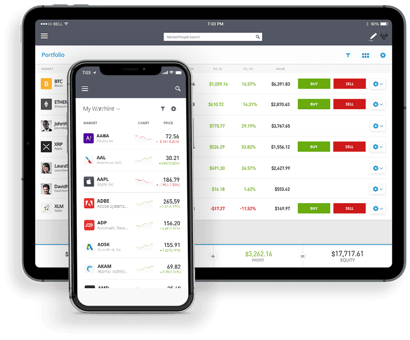Negociação social: CopyTrader do EToro permite que você copie e negocie automaticamente com base nos movimentos de outros negociantes. Como funciona: você escolhe um investidor que deseja copiar e, com um clique de um botão, pode começar a espelhar suas posições automaticamente (com a opção de um nível de stop-loss para limitar perdas potenciais).