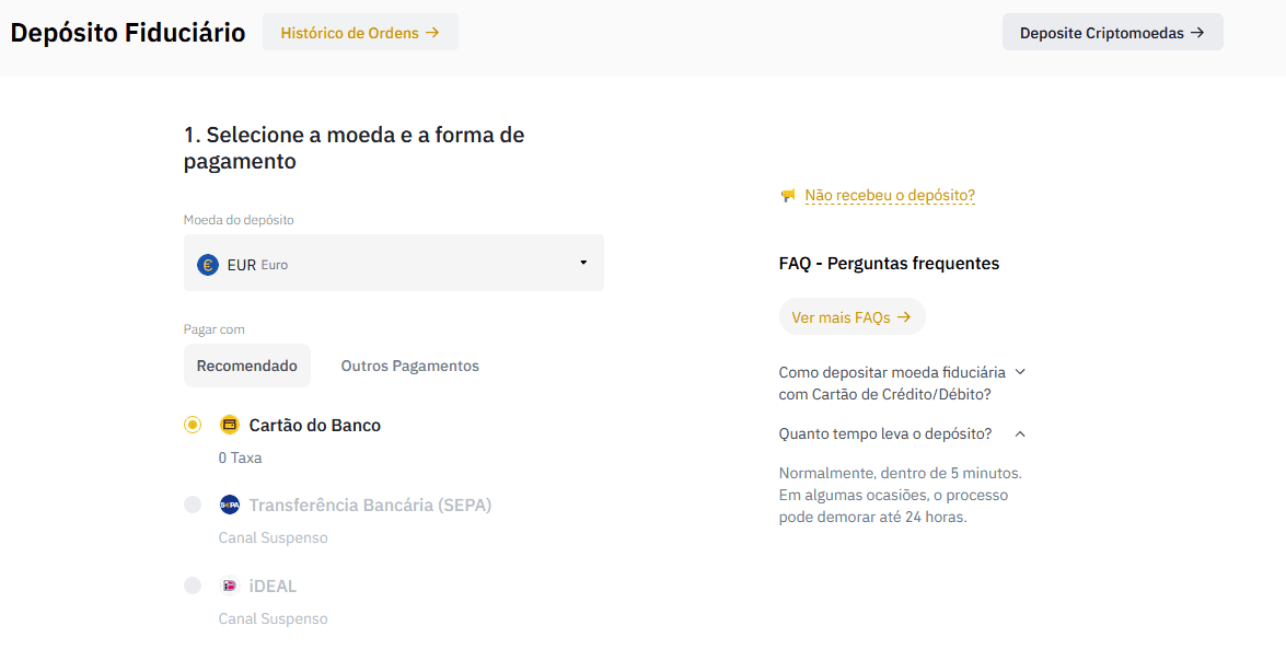 Bitfinex aceita EUR, JPY, GBP e USD como depósitos em moeda fiduciária. Os depósitos em moeda fiduciária só podem ser feitos por transferência bancária.